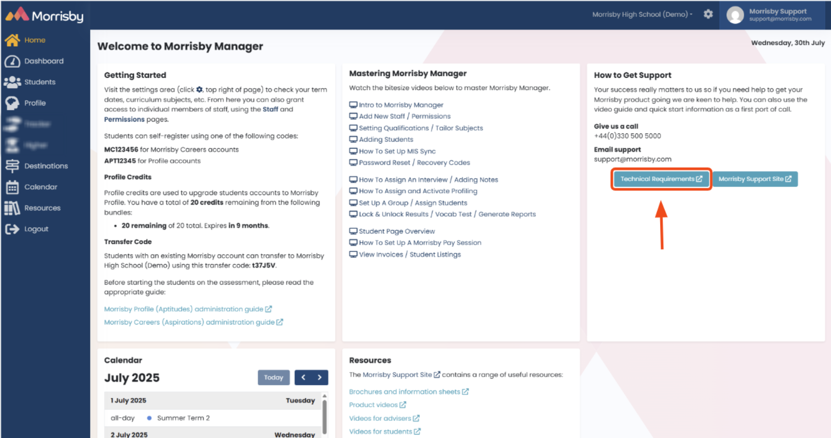 - Registration codes are also displayed on the Morrisby Manager homepage. The same code is used by all of your students.