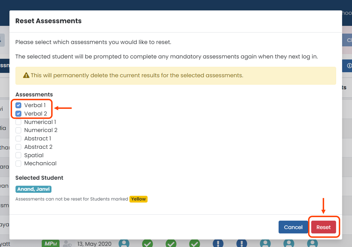 - In the dialogue window that opens, select the assessments you want to reset and click 'Reset':