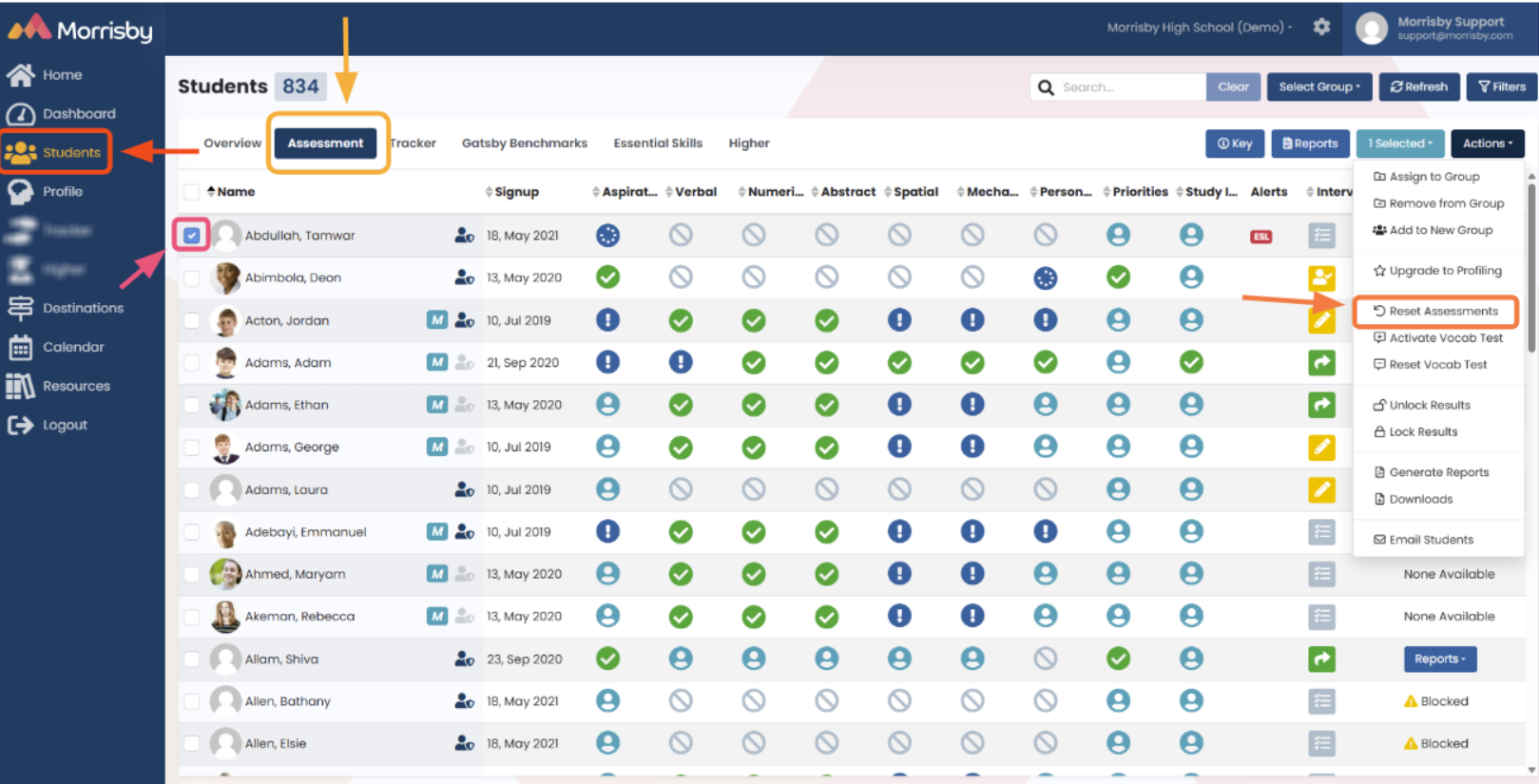 - Select 'Students' and find the student who needs an assessment(s) reset