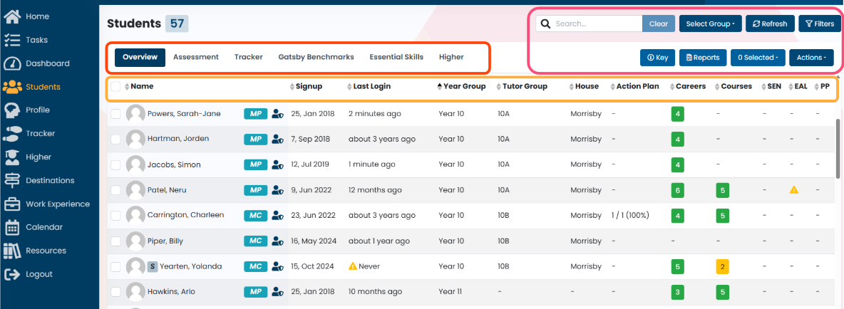 Assessment: Get a quick overview of student progress on questionnaires and assessments. This view highlights alerts, shows the status of Careers Guidance meetings, and provides one-click access to download individual student reports.